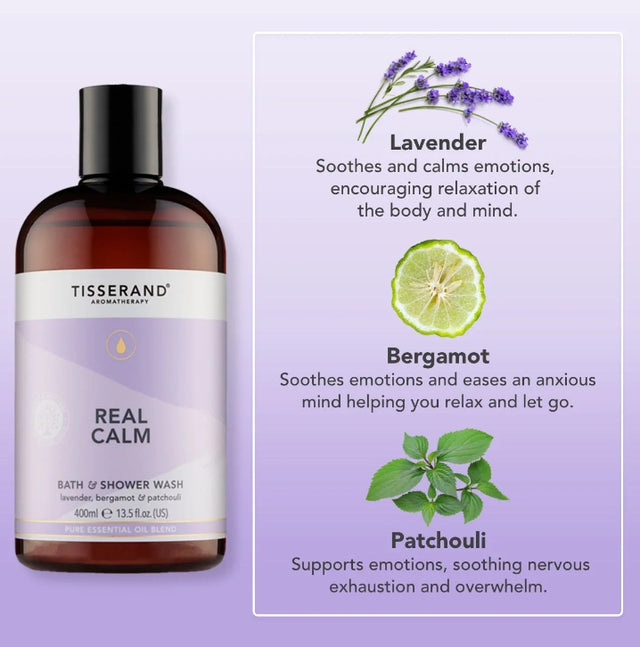 Turn your bath or shower into a calming ritual with the Real Calm Bath & Shower Wash. This soothing wash combines 100% natural pure essential oils of relaxing Lavender, comforting Bergamot and grounding Patchouli to help you clear away clouding thoughts and find your inner calm.